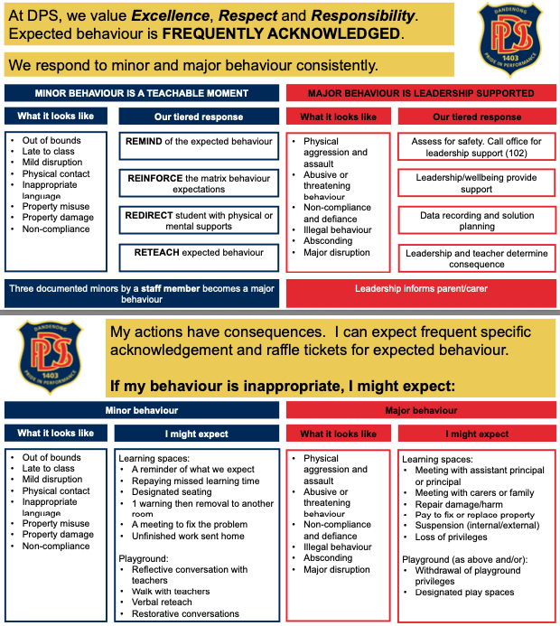 The graphics below are displayed in every learning space as a visual reminder of the steps staff take when students do not meet our school-wide expectations. Our approach focuses on supporting students to take responsibility for restoring relationships, developing a positive mindset, and repairing any harm.